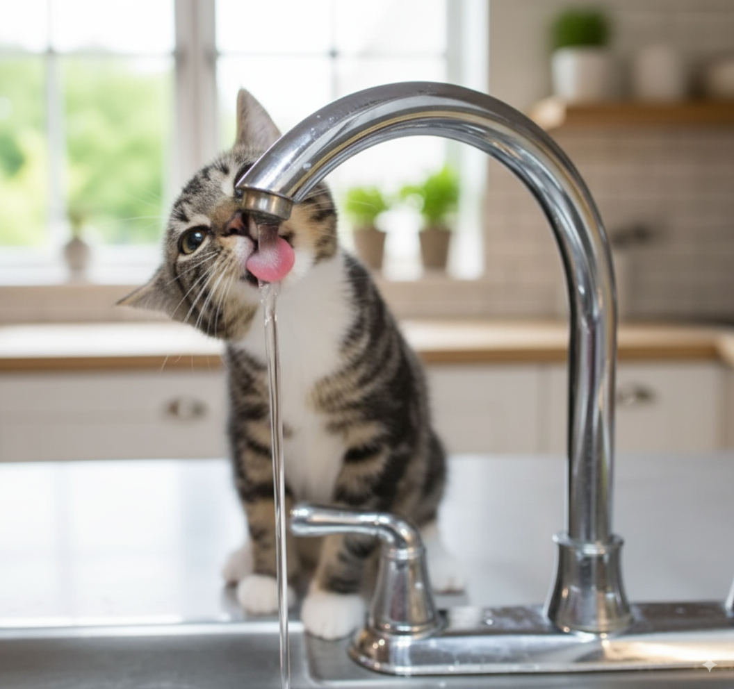 Ses sens ultra développés identifient cette eau comme stagnante et dangereuse. C'est pourquoi il choisira un robinet qui goutte, les toilettes, ou même une flaque boueuse plutôt que l'eau "fraîche" de sa gamelle : ces sources sentent et goûtent comme l'eau courante et riche en oxygène dans la nature.